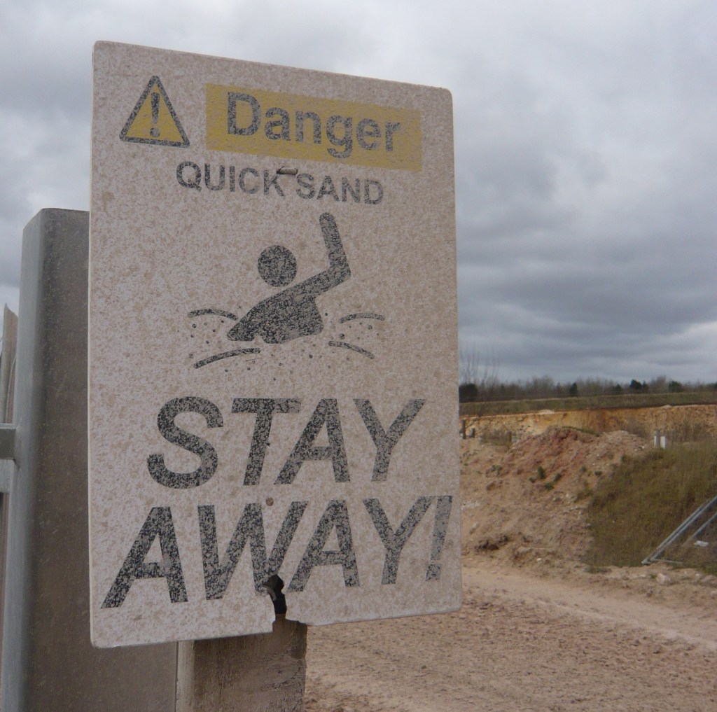 Either side of the embankment is a limestone quarry. Cross the quarry access road, noting the somewhat ambiguous sign warning of quicksand – is this person waving, or drowning? I have a fondness for these types of warning sign that depict some hapless bod in an unlikely pose – falling head first off a cliff, or pinned down by giant zig-zagging arrows. They always make me chuckle – probably not the intention.