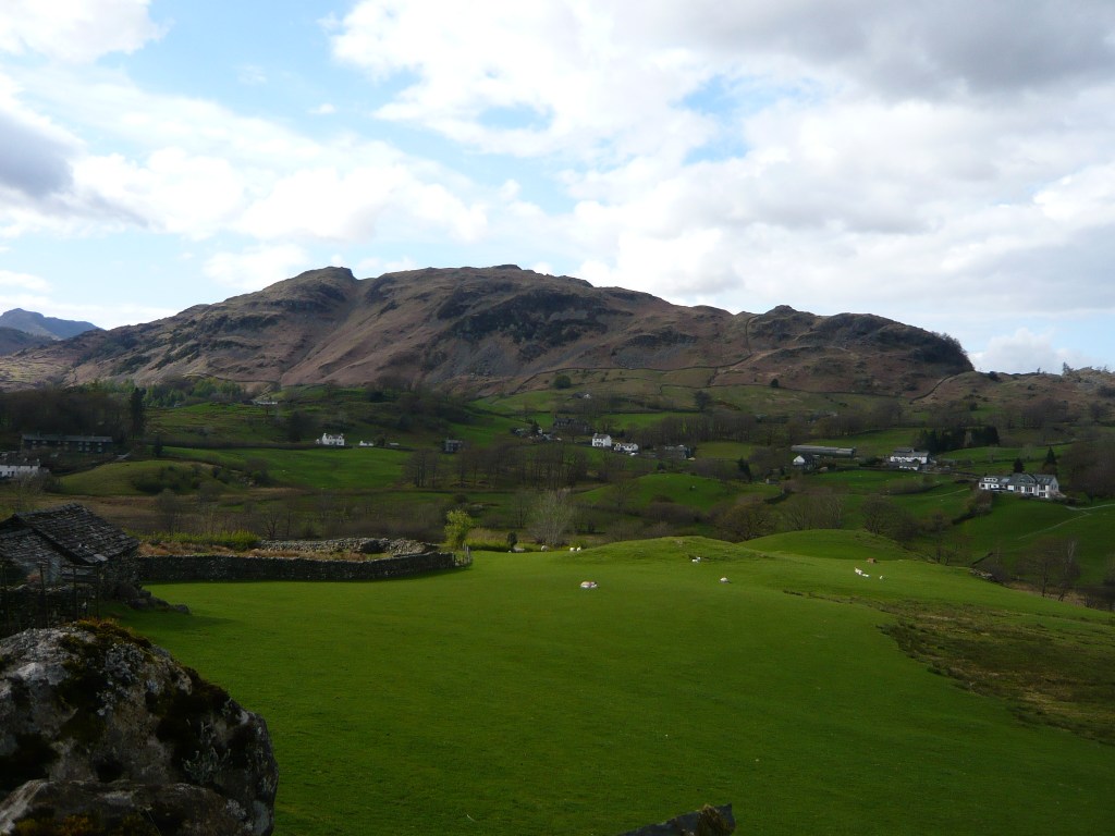 Continue alongside the river for a short way; the path then climbs up and away. When you reach the wall, turn right and go through the gate. Follow the track to a small cluster of cottages at High Park. Turn left as directed then right along the lane. When you reach farm buildings at Stang End, turn left signposted Hodge Close. This lane takes you through what I think of as typical Beatrix Potter country: stone walls, scattered farmsteads, white-washed cottages, hedgerows and green fields and beyond, the fells of Little Langdale. As the undulating path rises, slate workings come into view.