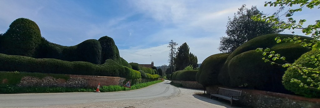 Continue along the road through Skirmett to the T-junction at the end of the village. Turn left and almost immediately right to pick up the Chiltern Way again. The route back to Hambleden from here is straightforward. Follow the footpath over several wide fields, over a farm track, through a patch of young trees, across a lane and along a tree-lined path between fields. Emerging by Colstrope Farm, follow the lane ahead past undulating topiary hedges for a short way before leaving the lane where it bends right.