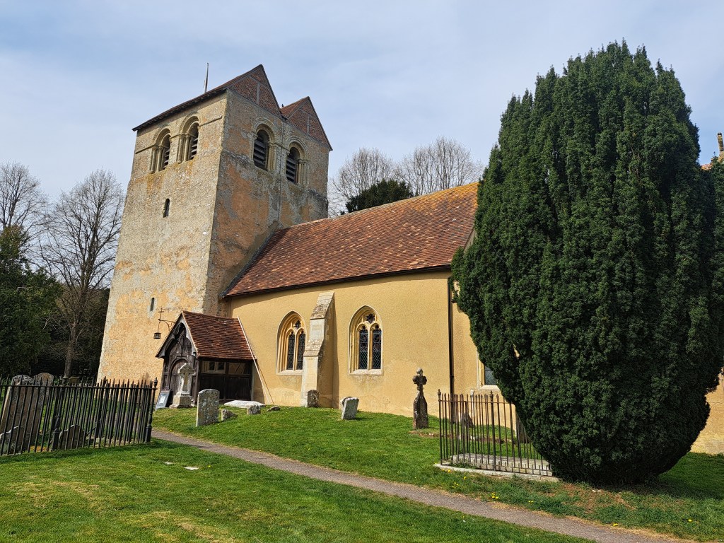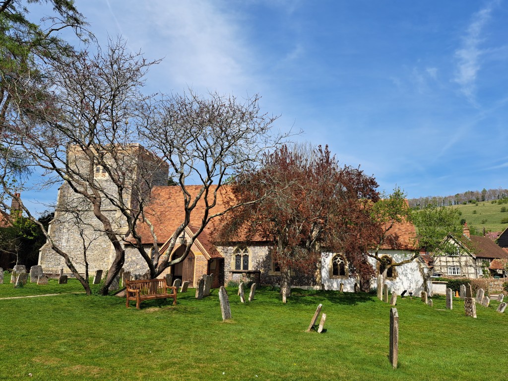 Continue along the lane and over a stile at Southend Farm. Here you have the first glimpse of the windmill in the distance, with the line of the path dipping and rising ahead. Follow the path steeply down, cross straight over the road and continue down into Turville, ignoring paths joining on the right and left. Follow the lane down into the village centre. The pretty church of St Mary with its squat tower and built largely of flint is worth a closer look.