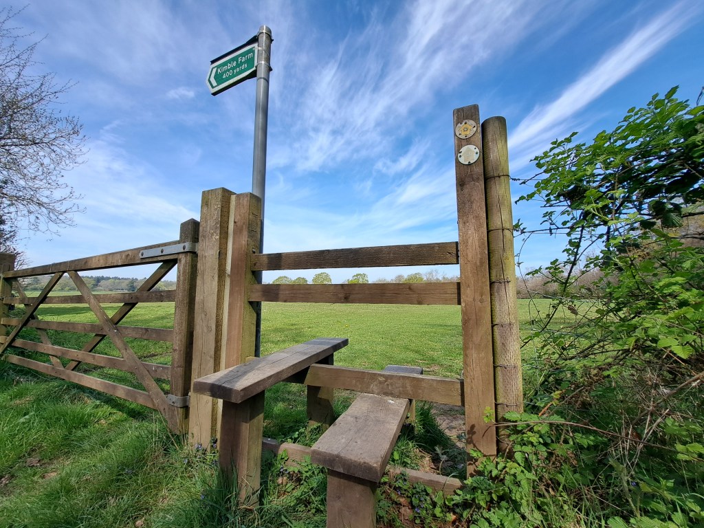 Go straight across the field and into the woods again. Continue straight on at a crossroads of paths, through a kissing gate and out of the woods into a large field with fine views. Follow the hedge line on your left looking out for a stile. Don’t go over the stile but leave Shakespeare’s Way to head diagonally right across the field towards trees. Go through a kissing gate and down through holly. Go through another gate and across a field to a narrow lane. Turn right here; the route now picks up another long-distance path, the Chiltern Way.